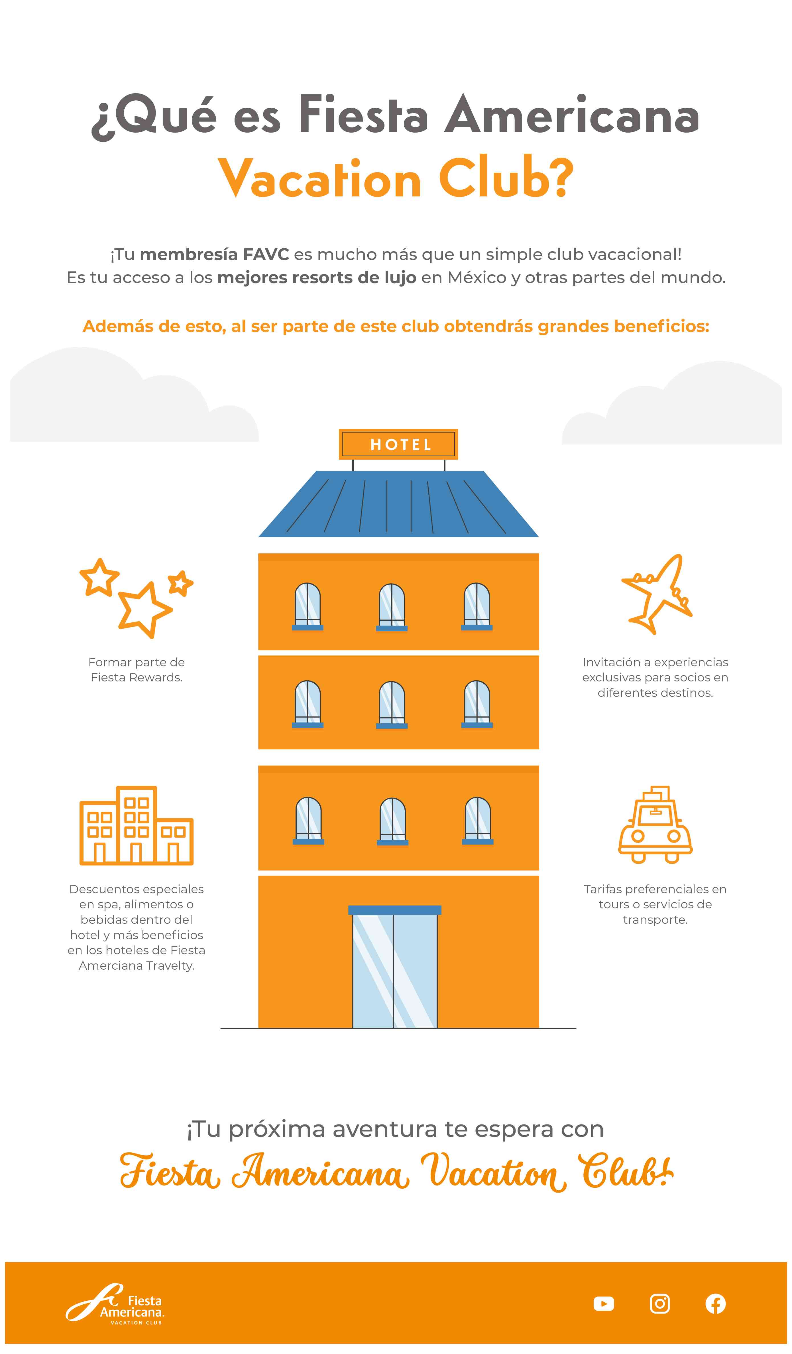 Fiesta Americana Vacation Club es tu pase a vacaciones inolvidables por años. Como socio usas puntos para hospedaje (en hoteles o resorts), recibes atención especial, descuentos y promociones exclusivas cada mes, como noches gratis y tarifas especiales. Además, puedes acceder a más de un millón de hoteles en todo el mundo gracias a nuestras alianzas.