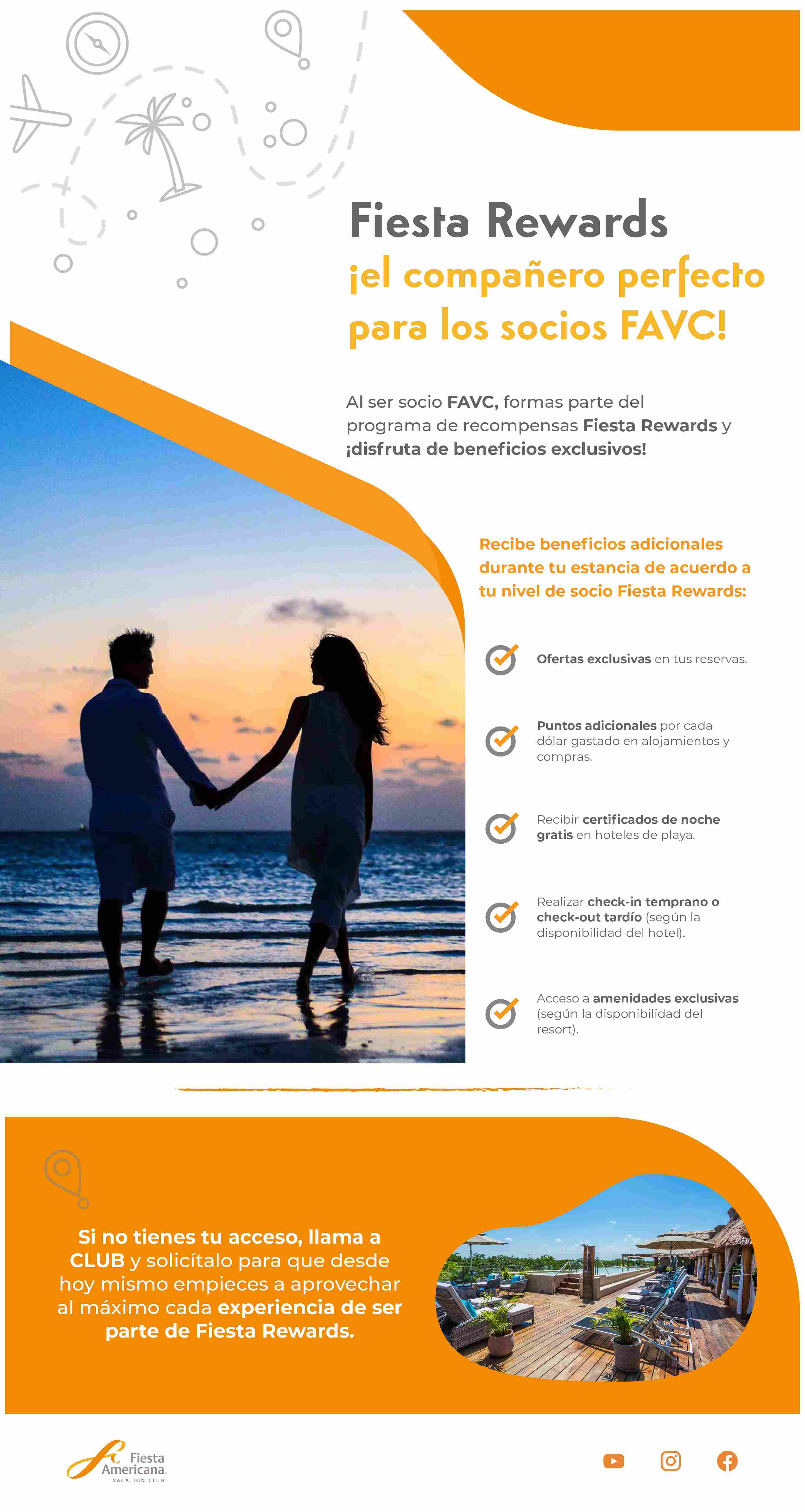 Si eres miembro del programa de recompensas Fiesta Rewards y te interesa formar parte de Fiesta Americana Vacation Club igualmente comunícate con nosotros mediante los canales de atención FAVC. ¡Será un gusto atenderte!